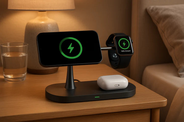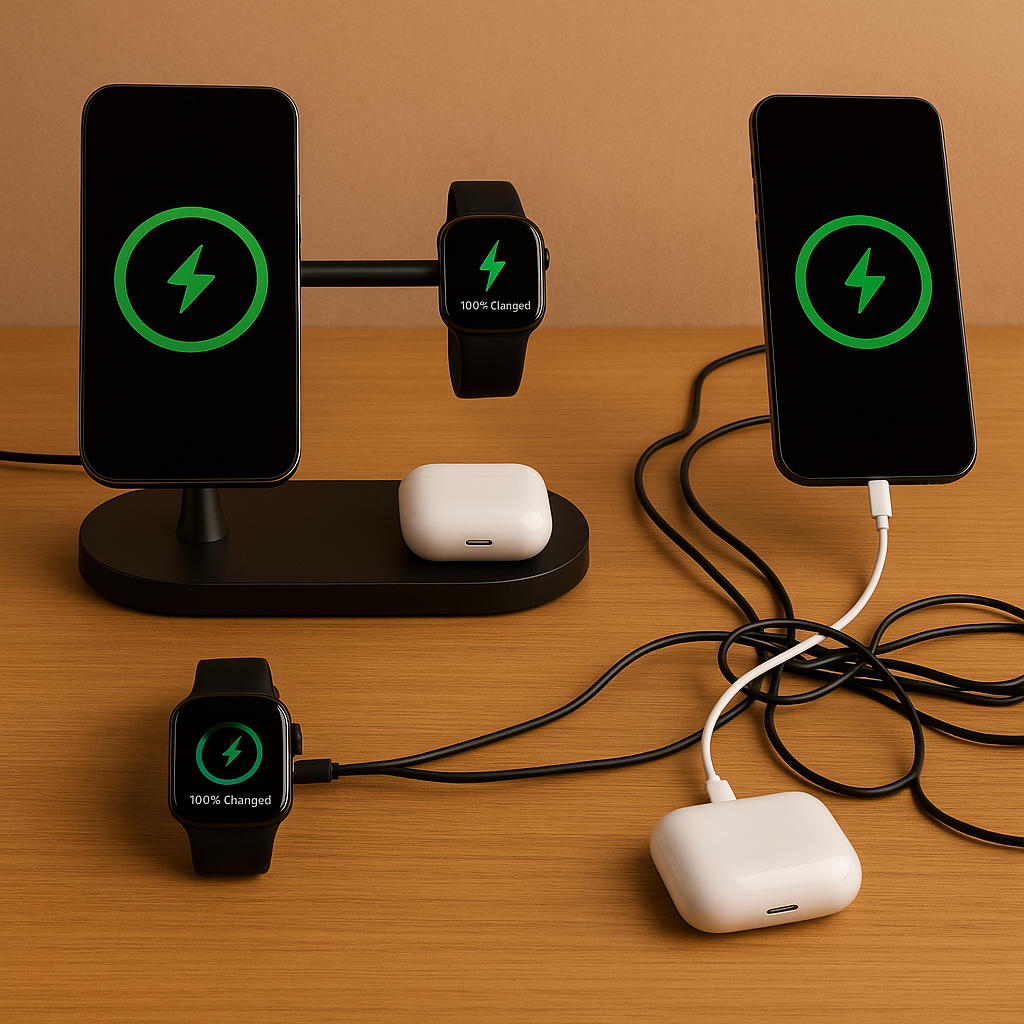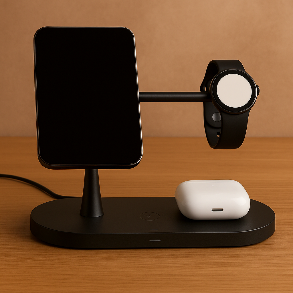 Charge simultanée de 3 appareils : smartphone, montre connectée, écouteurs.